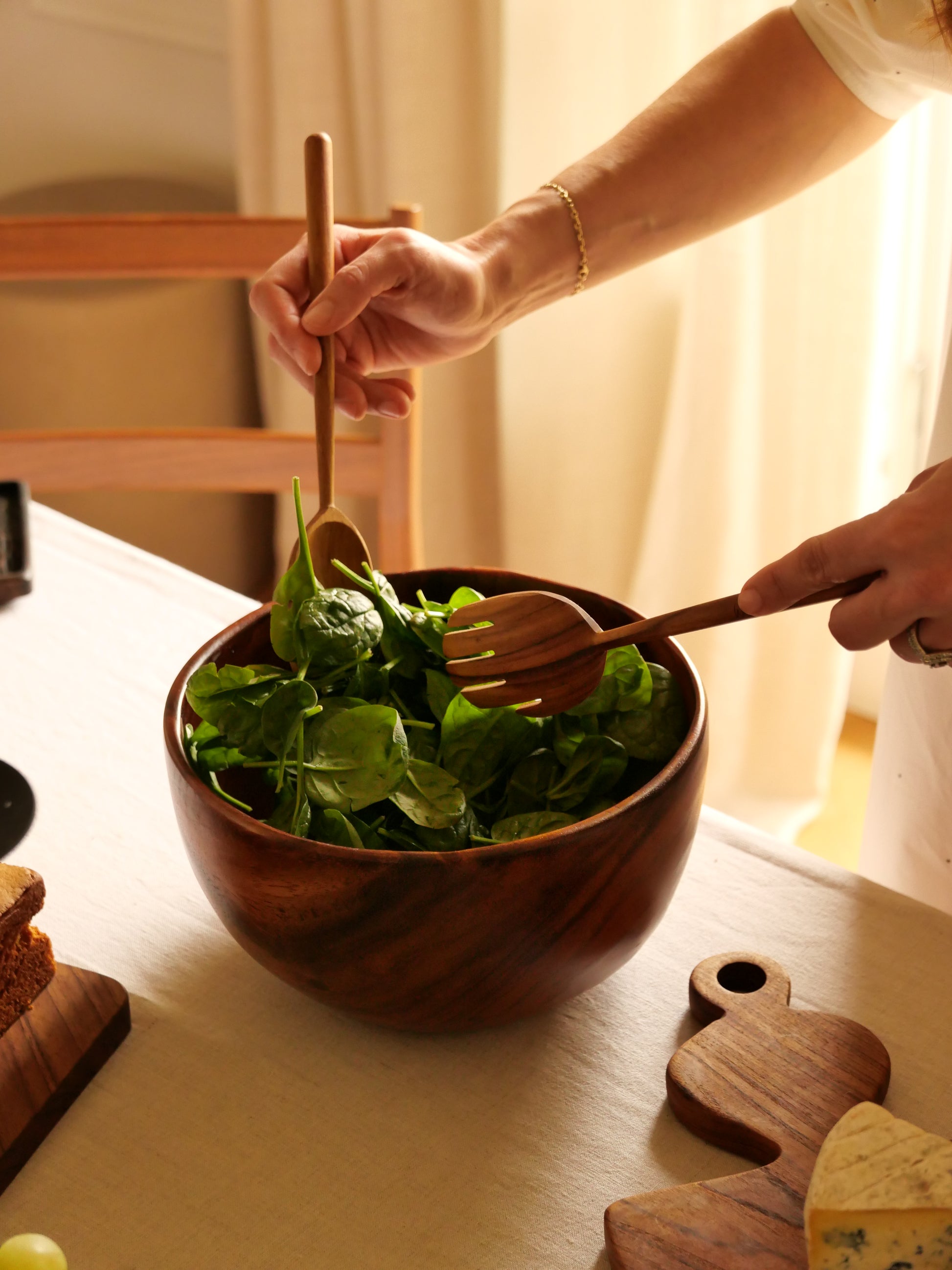 Le suar, reconnu pour sa solidité et sa beauté naturelle, confère à ce saladier une allure chaleureuse et organique, capable de sublimer chaque moment du quotidien.