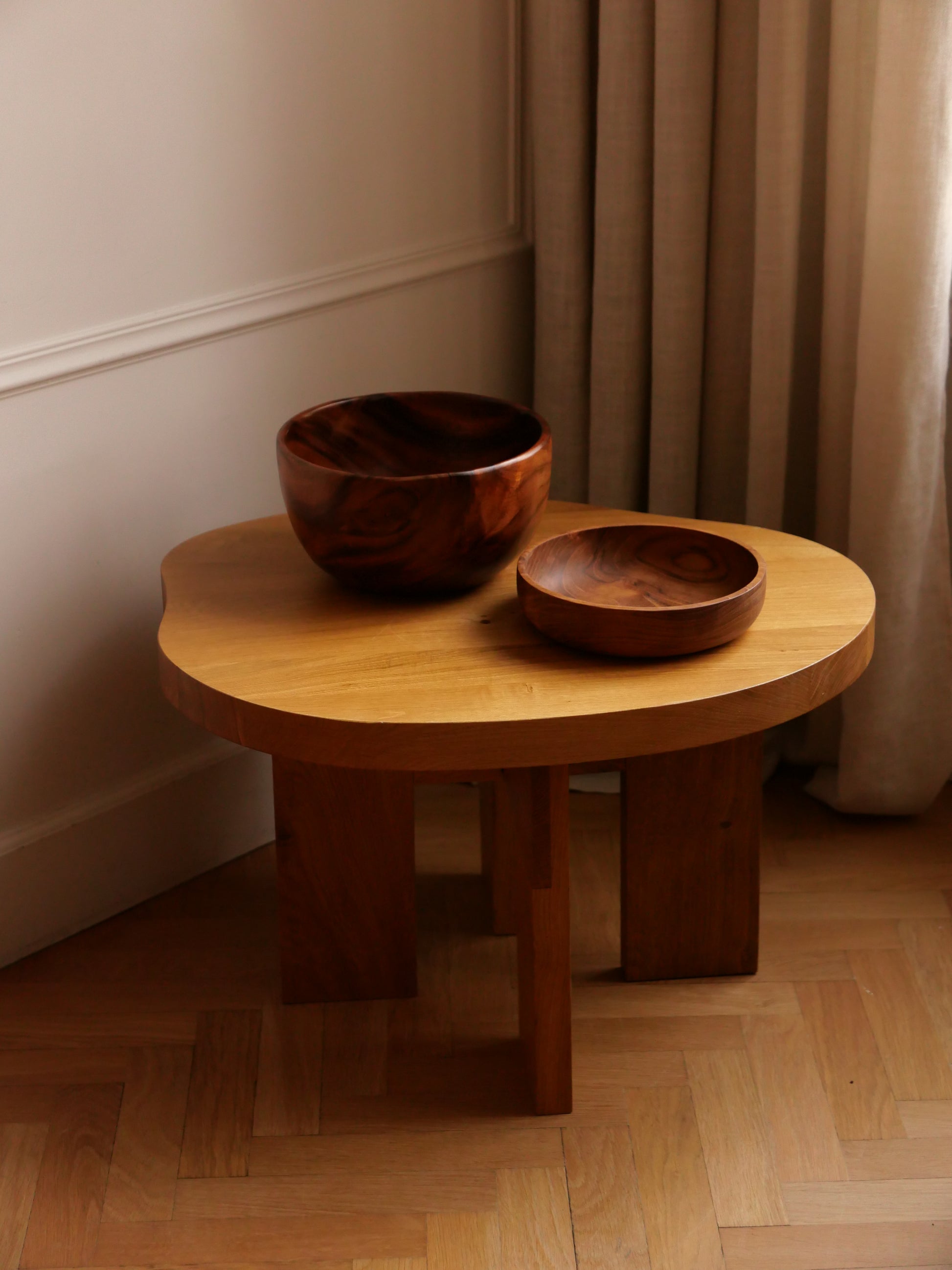Ce saladier en bois de suar est une pièce d’une grande présence, où se rencontrent douceur des formes et richesse du bois. Son galbe généreux met en valeur les veines naturelles du suar, oscillant entre tons miel et bruns profonds, créant un jeu de nuances unique à chaque exemplaire.