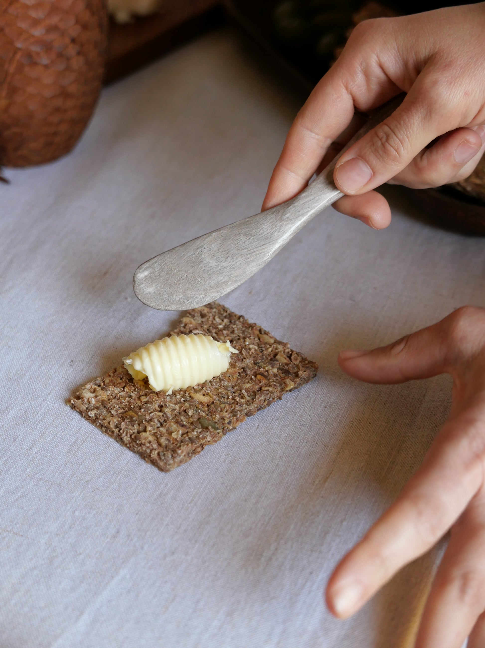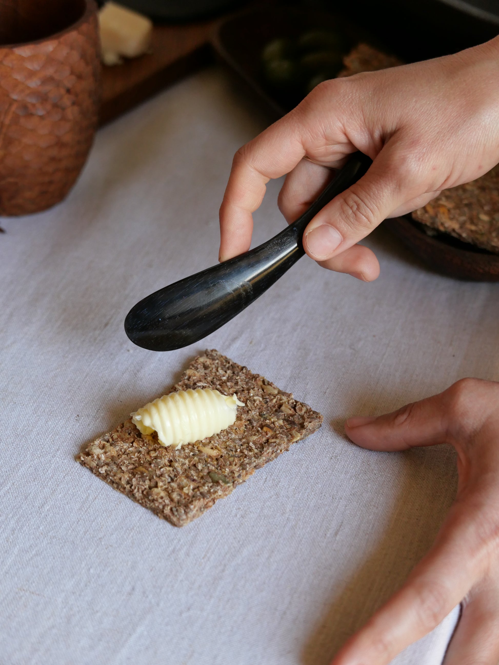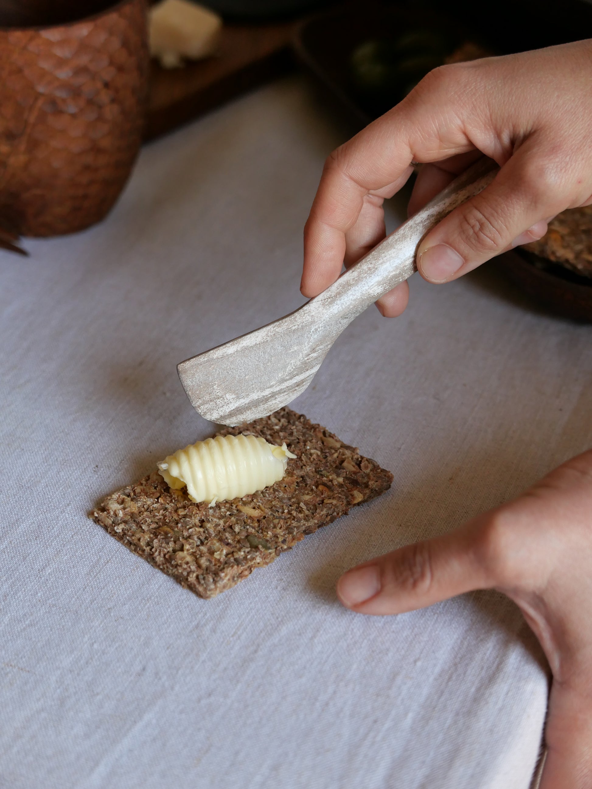 Découvrez notre couteau à beurre en bois pétrifié, un outil unique et pratique pour étaler votre beurre de manière efficace.