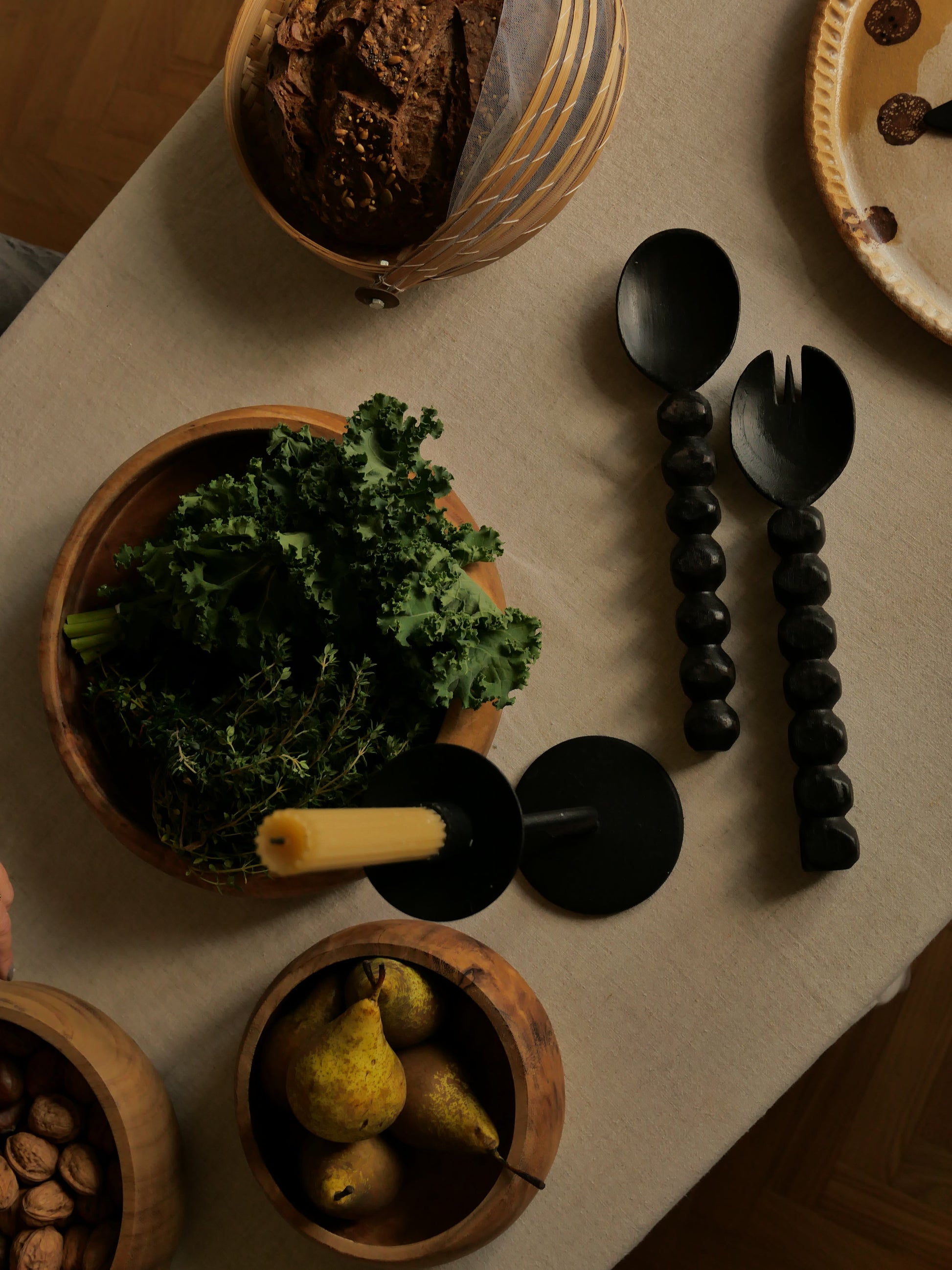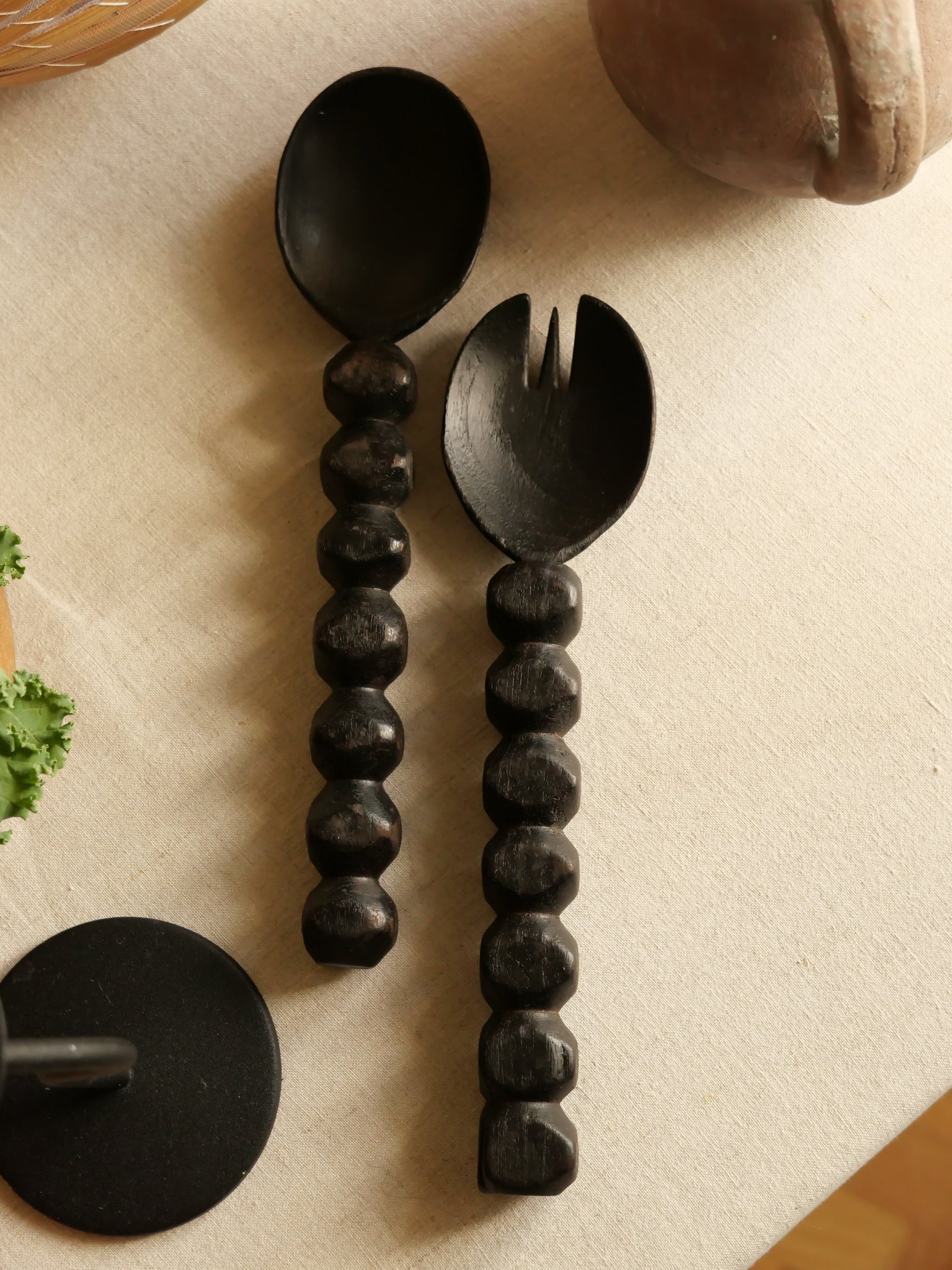 Apportez une touche ethnique et chaleureuse à vos repas avec les couverts à salade Bola, entièrement faits à la main à partir de bois brûlé.