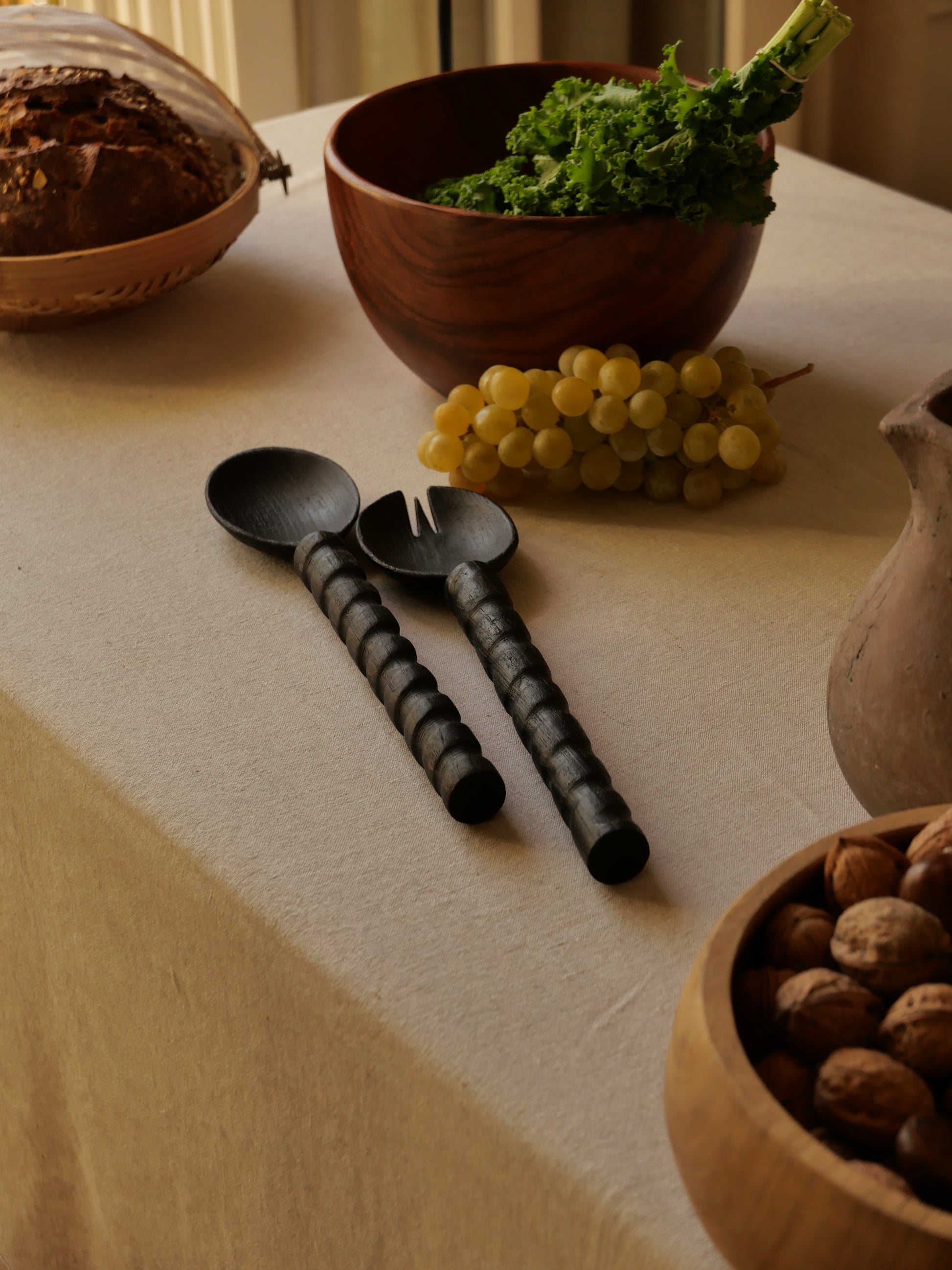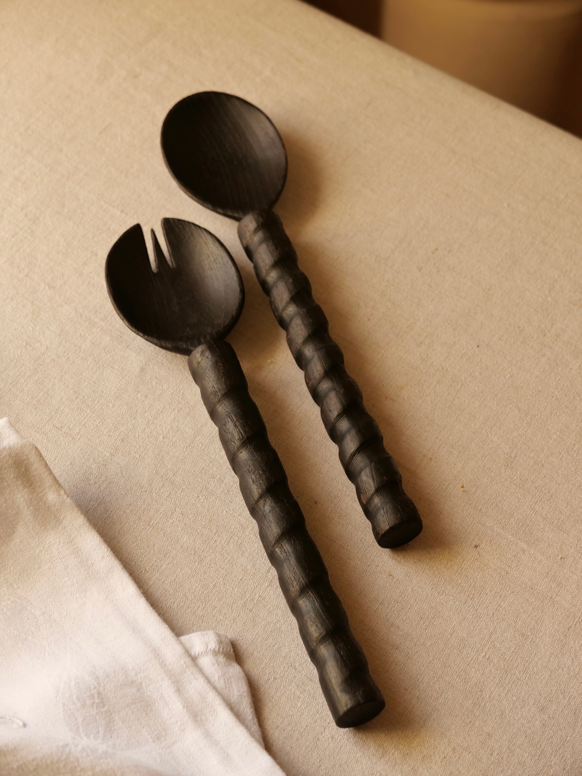 Ajoutez une touche d’originalité à votre table avec ces couverts à salade vrillés, disponibles en bois brulé.