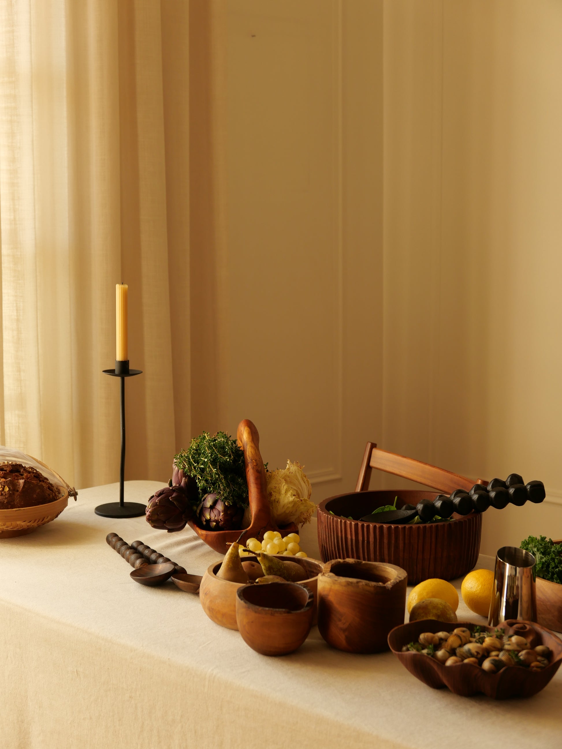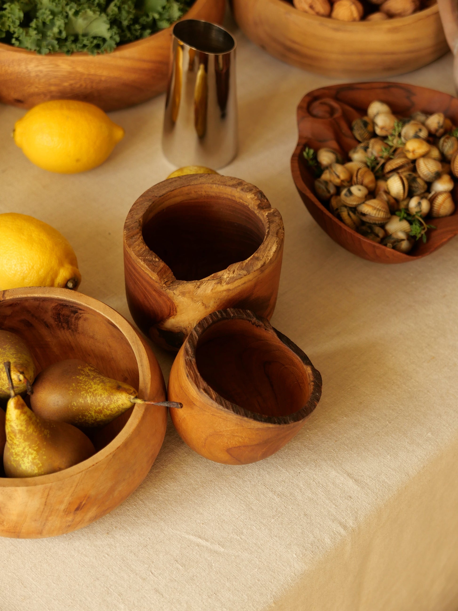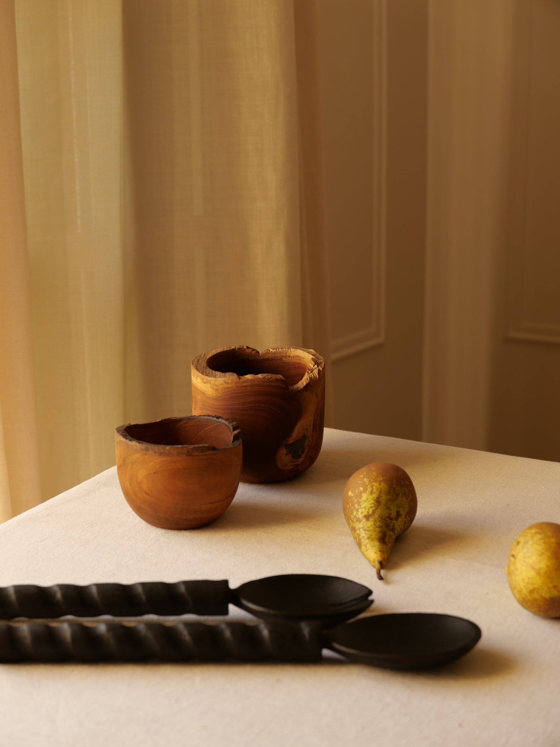 Taillé directement dans une pièce de bois massif, ce lot de 2 bols révèle toute la beauté brute et authentique de la matière. Ses bords naturels, laissés volontairement irréguliers, racontent l’histoire du bois d’origine et donnent à chaque pièce un caractère unique, presque sculptural.