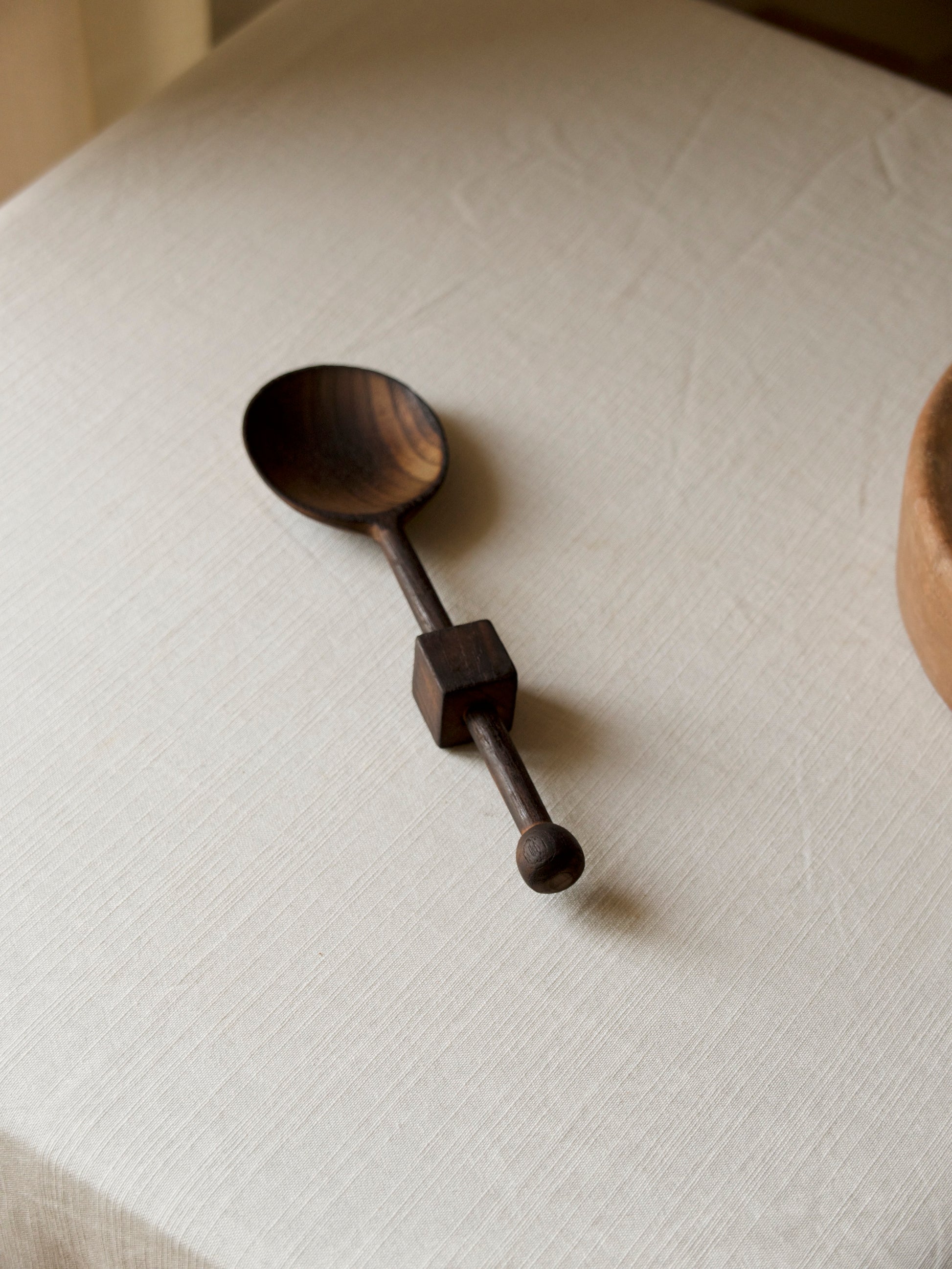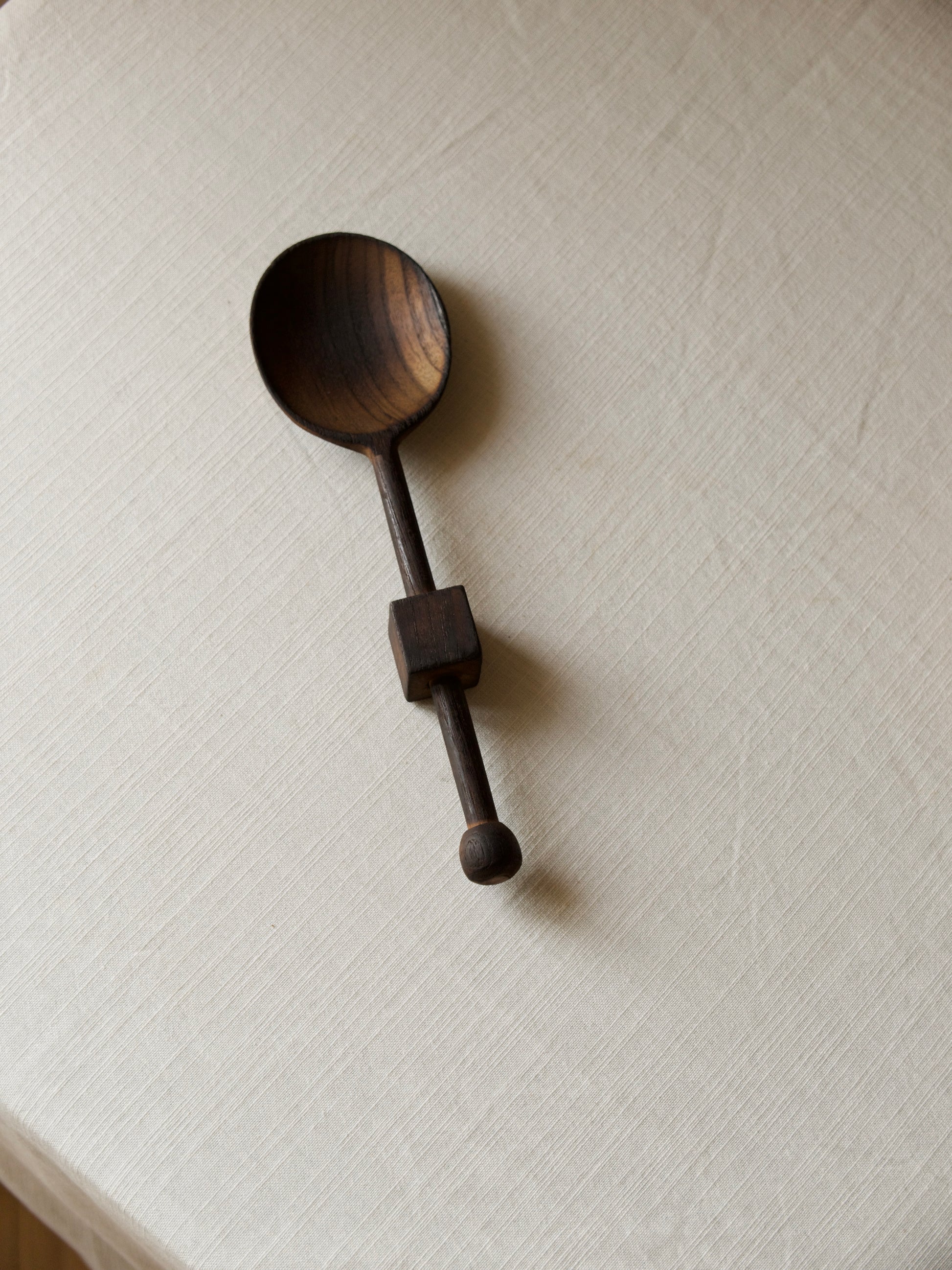Le manche de la cuillère est fabriqué en bois brûlé, ce qui lui confère une apparence unique et contemporaine. Le bois brûlé est travaillé avec soin pour révéler les motifs naturels du bois, créant ainsi une texture et une couleur riches et attrayantes.