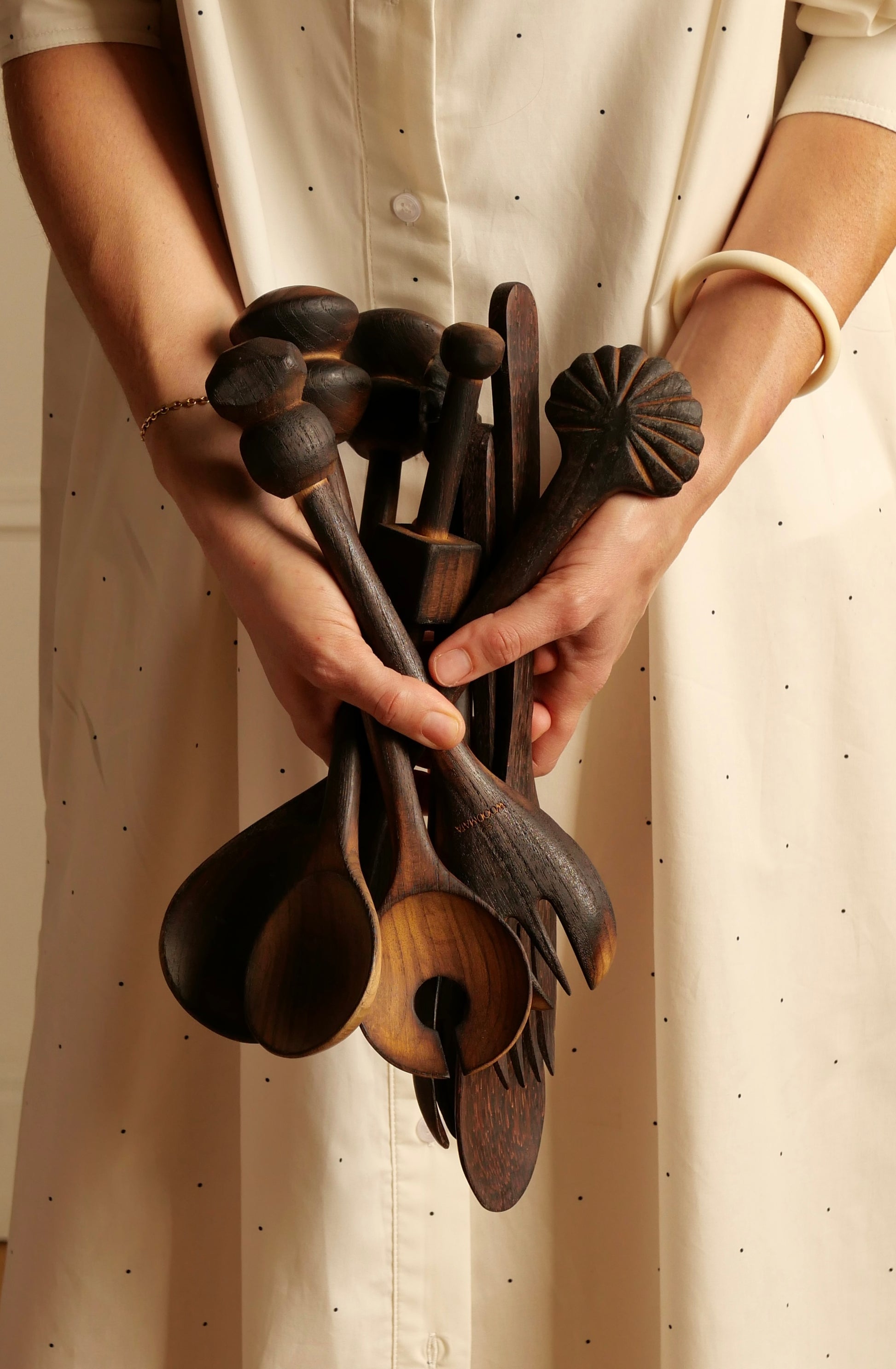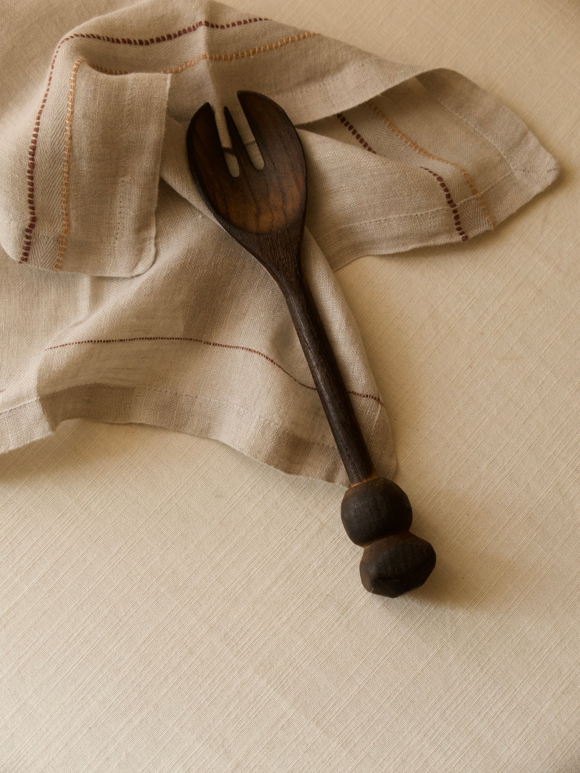 La fourchette est fabriqué en bois brûlé, ce qui lui confère une allure unique et contemporaine. Le bois brûlé est soigneusement travaillé pour révéler les motifs naturels du bois, créant ainsi une texture et une couleur riches et attrayantes.