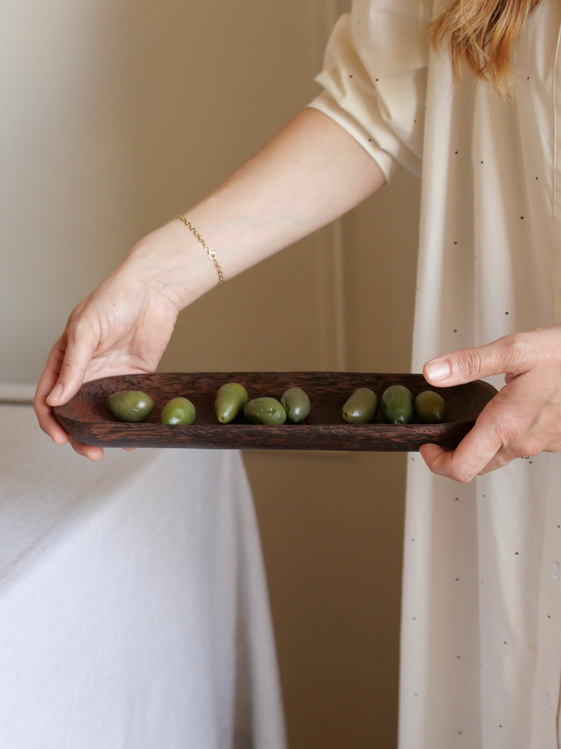 - 1x Assiette longue en coco parfaits pour accueillir olives et canapés (30 x 9 x 1,5 cm)