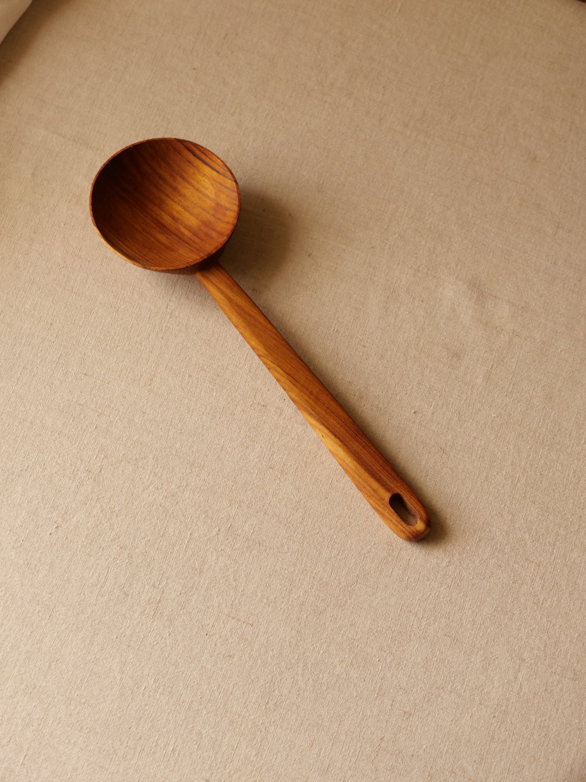 Sa cuve généreuse permet de servir facilement soupes, sauces ou plats mijotés, tandis que son manche long et fuselé assure une prise en main confortable et sécurisée. Résistant par nature à l’humidité et aux variations de température, le teck en fait un ustensile conçu pour durer, tout en préservant vos casseroles grâce à sa surface non abrasive.