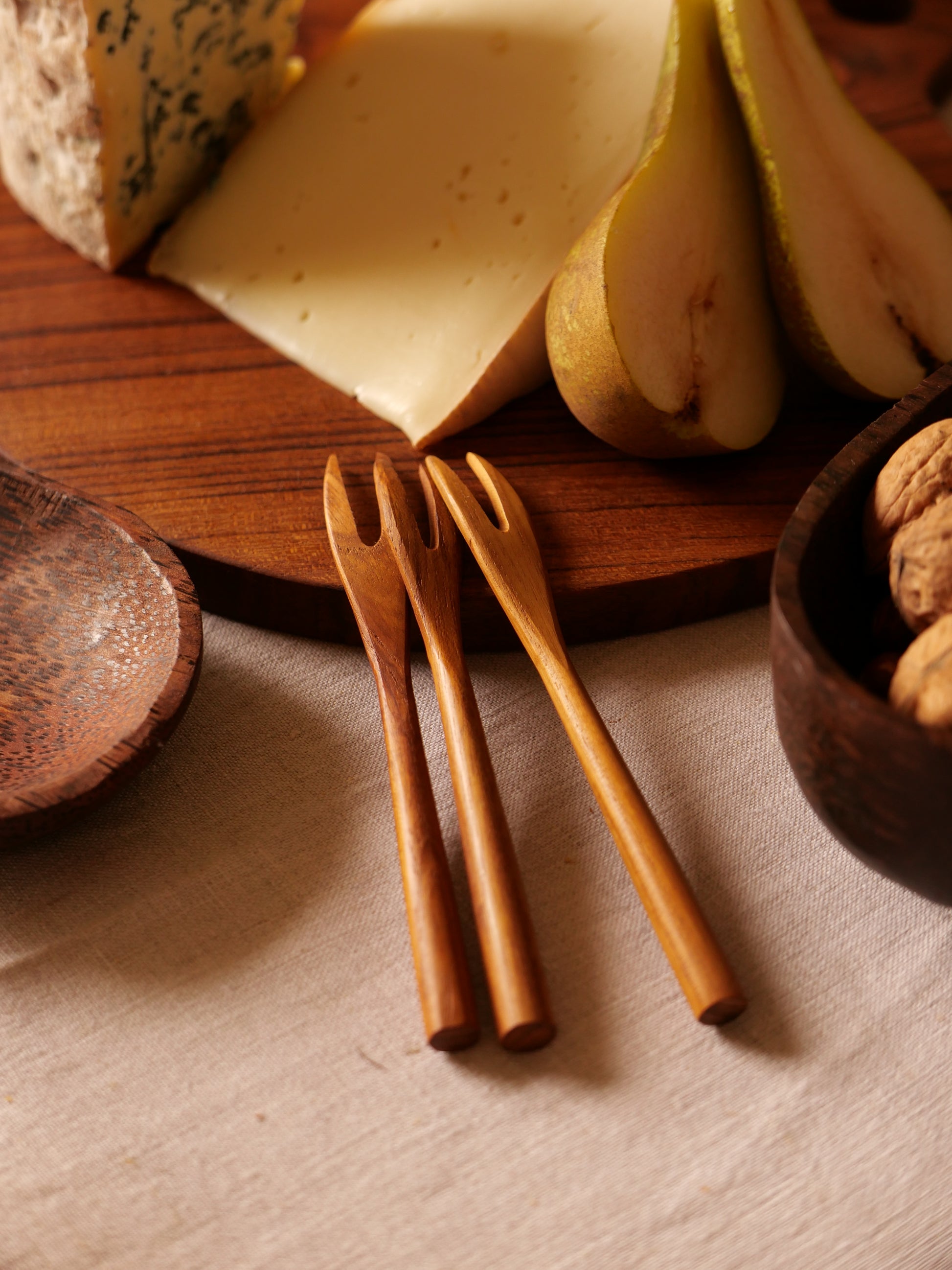 Chaque pic est façonné à la main, révélant le grain unique du teck et la finesse de sa silhouette. Leur petite fourche sculptée assure une excellente prise des aliments tout en offrant un design simple et raffiné, idéal pour sublimer vos plateaux d’apéritif.
