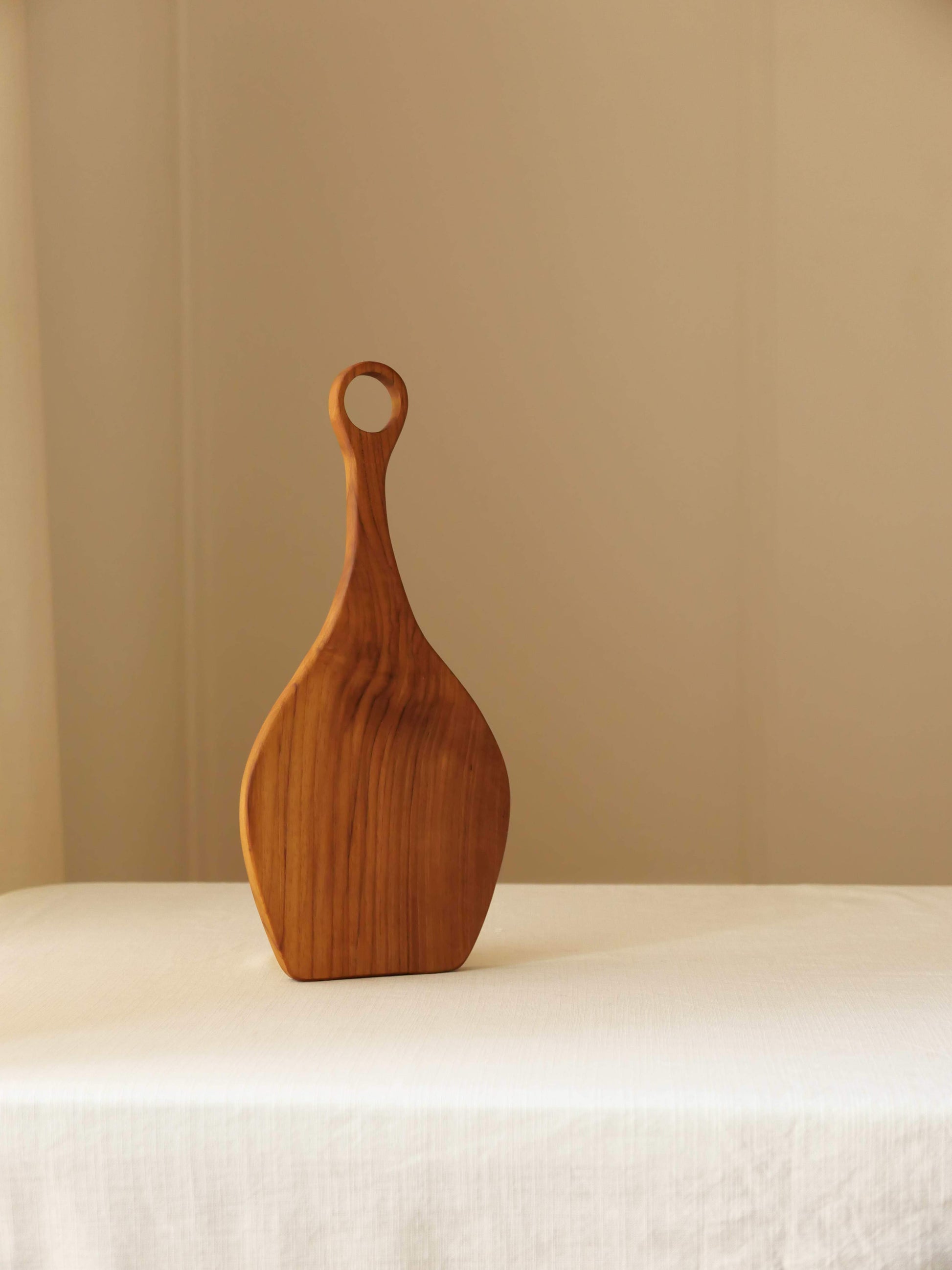Cette planche en bois de teck se distingue par sa forme originale de bouteille, à la fois décorative et parfaitement fonctionnelle. Son design élancé, terminé par une anse arrondie, facilite la prise en main tout en apportant une touche chaleureuse et authentique à la table.