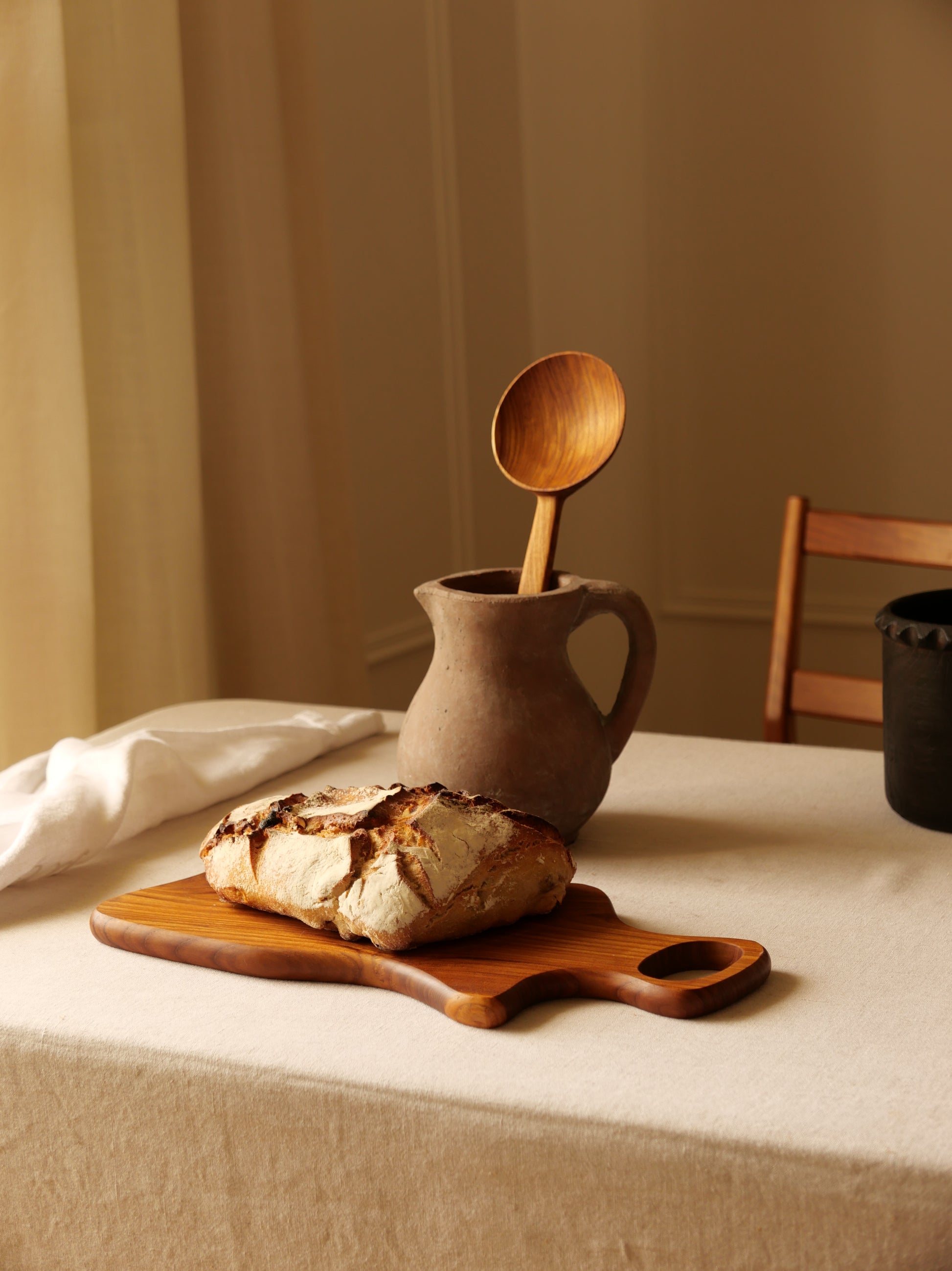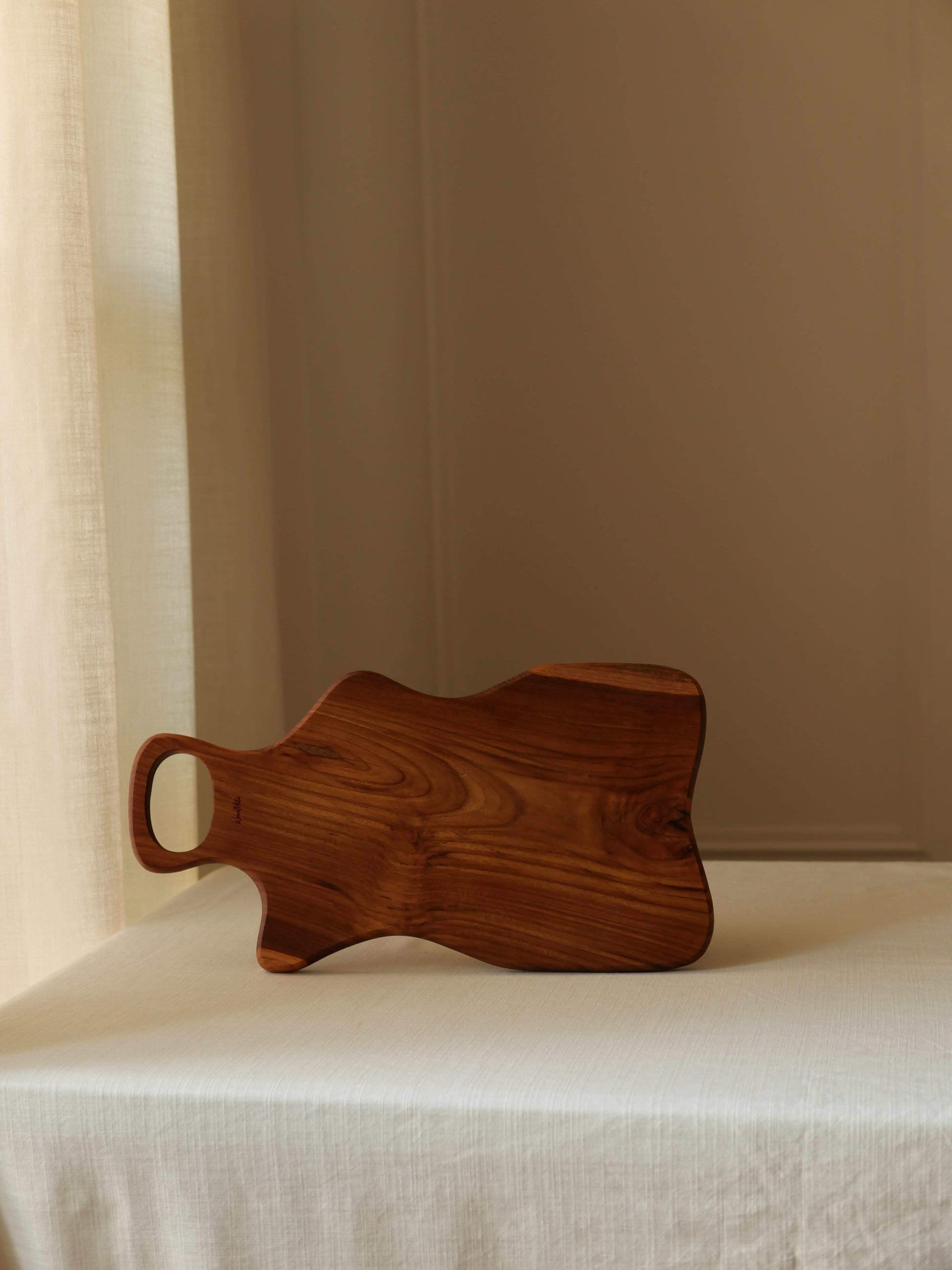 Avec ses lignes douces et son design sculptural, cette planche en teck se distingue par son élégante silhouette ondulée. Ses courbes, à la fois subtiles et maîtrisées, apportent un équilibre parfait entre fonctionnalité et esthétique. Elles créent un mouvement visuel unique, presque organique, qui rappelle la fluidité naturelle du bois lui-même.